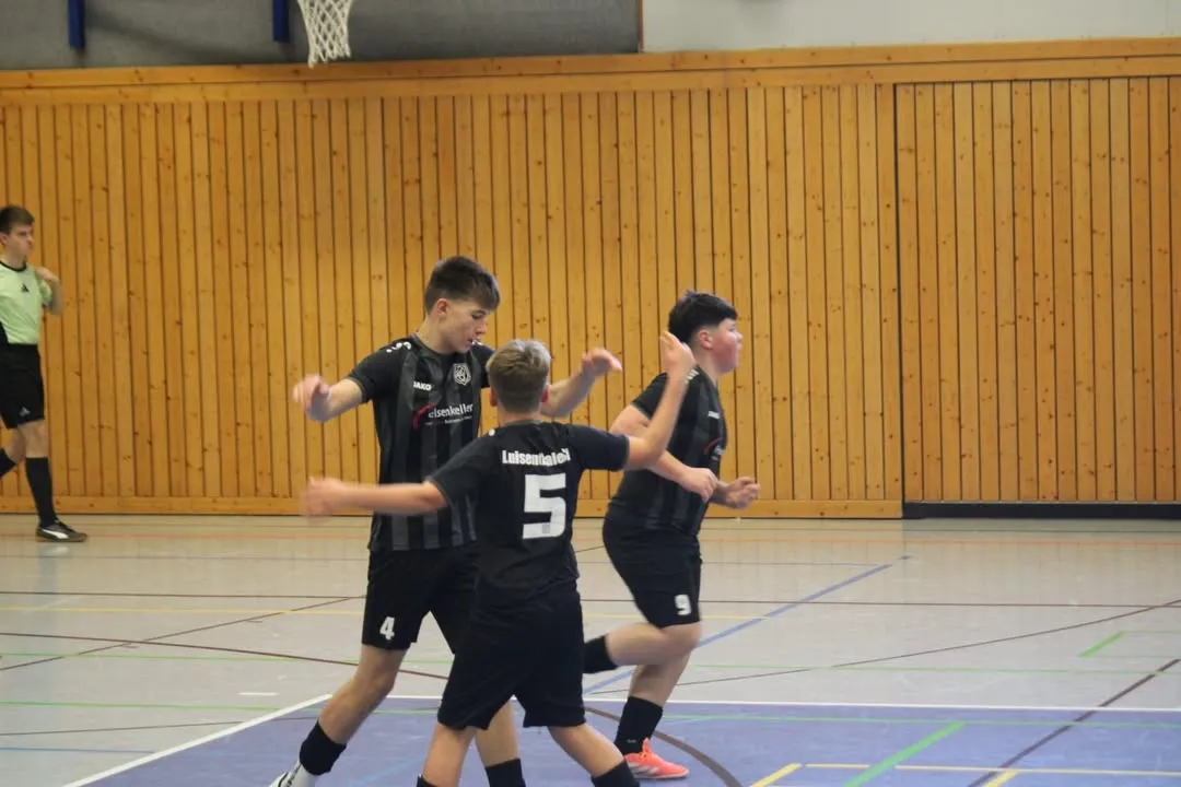 Unsere B-Junioren waren zum Nikolaustag in der Körnberghalle in Friedrichroda bereits um 9:00 Uhr gefordert. Trotz der frühen Startzeit und des Glühweinabends am Vortag waren unsere Jungs gleich voll im Turnier drin. Gegen das Kreisoberligatopteam aus Remstädt verdienten wir uns zum Auftakt ein 1:1 Unentschieden. In dem offenen Schlagabtausch war vor allem Leon im Tor hellwach und hielt, was zu halten ging. Offensiv hatten wir ebenso einige klare Möglichkeiten, so dass das Remis in Ordnung ging. Im folgenden Spiel gegen Apfelstädt legten wir los wie die Feuerwehr, bereits nach einer Minute hatte Aleks vier Treffer erzielt. Wir nahmen nun etwas Tempo raus und gewannen am Ende trotzdem klar mit 7:0.